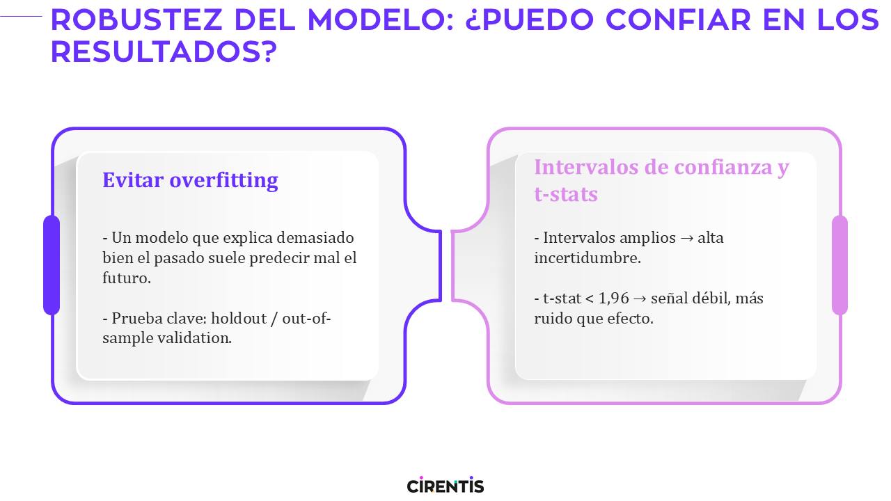 🔹 Intervalos de confianza y t-stats Los coeficientes sin incertidumbre asociada no son accionables. – Intervalos amplios → alta incertidumbre. – t-stat < 1,96 → más ruido que efecto real.