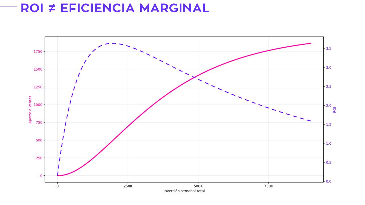 El problema es que el ROI medio mira hacia atrás. Y las decisiones de inversión miran hacia adelante. Las recomendaciones correctas no se basan en el ROI histórico. Se basan en el impacto incremental en el margen actual de inversión. Y eso es otra cosa.